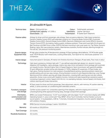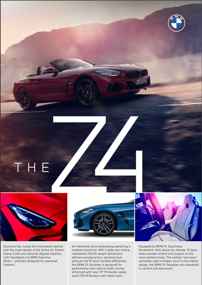 The iconic BMW Z4 Roadster pushes the boundaries. Take it further with available Adaptive M suspension and the M Sport package for even more dynamic driving. Above all, the Z4 is a unique driving experience that makes freedom tangible, from the first mile to far beyond the horizon.